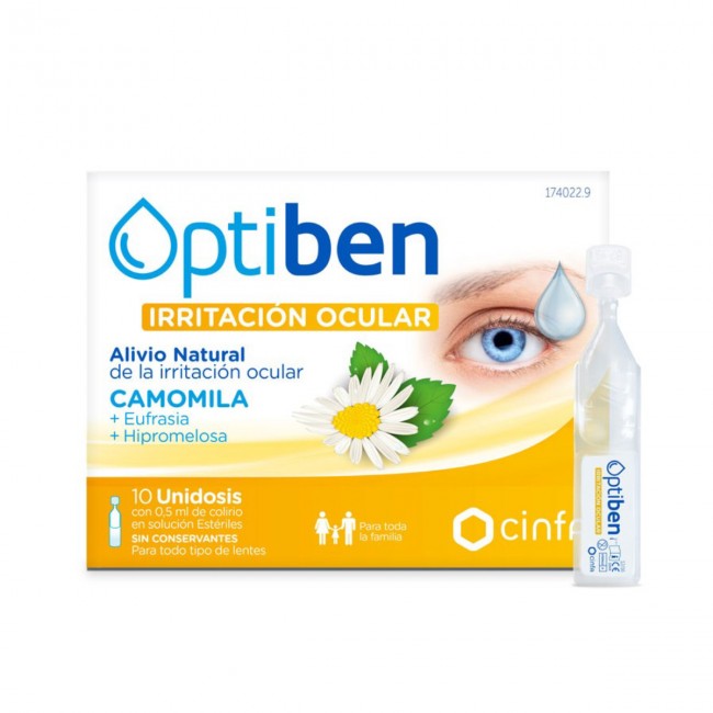 Alivia la sensación de irritación leve cuya causa es el cansancio ocular o por diferentes factores ambientales como el uso prolongado frente al ordenador, aires acondicionados o calefacción, contaminación, ojos secos y/o rojos, la exposición prolongada tanto al agua de piscinas, aguas saladas, rayos solares, polvo y viento, el humo del tabaco, etc. Compatible con todo tipo de lentes. Modo de empleo de Optiben Irritación Ocular Se recomienda aplicar 1 ó 2 gotas en cada ojo cuando se necesite en el párpado inferior y según la recomendación de su médico. Se puede usar tantas veces sea necesario. Se recomienda usar antes de ponerse las lentillas. Para aumentar la comodidad a la hora de ponerse lentillas, colocar un par de gotas en cada lente antes de su colocación. Previo a su empleo, es co